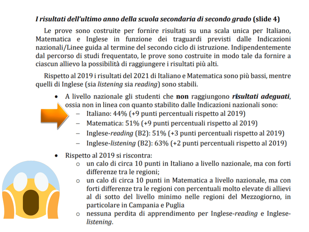 Grande clamore ha suscitato l’uscita dei dati Invalsi 2021 (qui la pagina con tutti i numeri) che mettono in evidenza un calo ulteriore delle già deboli competenze di base in italiano, matematica e inglese degli studenti delle classi terminali del 1^ e 2^ ciclo; nello specifico, a fare scalpore sono soprattutto i numeri della scuola secondaria di II grado, con il 39% degli studenti che non è arrivato al livello minimo di italiano e addirittura il 45% in matematica; quasi il 10% poi ottiene il diploma, ma con delle competenze di base fortemente inadeguate. Come sempre, cercherò di fare qualche riflessione limitandomi però al segmento di istruzione in cui lavoro, consapevole che alcune dinamiche sono, ahimé, presenti anche al I ciclo.