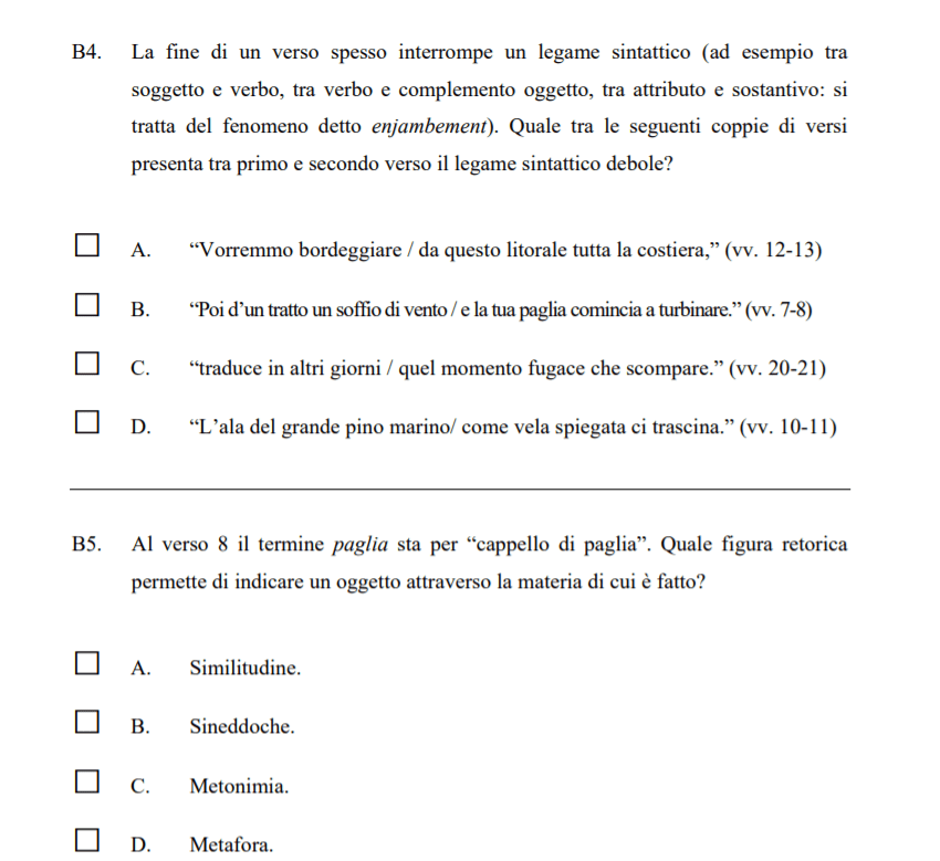 Per quanto riguarda la disciplina che insegno, ahimé, i manuali (anche del biennio) stanno cercando da tempo di conciliare “verifiche invalsi” e contenuti previsti dalle Indicazioni nazionali, ma secondo me gli esiti sono a volte discutibili: strutturare una verifica modellata sulle prove invalsi per un passo dell’Iliade, dei Promessi sposi o una poesia di Montale è un’operazione didatticamente discutibile per la complessità e polisemia di tali testi che rifuggono da risposte univoche, a risposta chiusa, a completamento (qui sotto alcuni quesiti tratti dalla poesia Nel giardino di Montale e usata dall’invalsi per un fac-simile di prova destinata alla classe terza). Si tratta, forse, del desiderio di “salvare capra a cavoli” degli editori, consapevoli che per il docente di lettere portare avanti l’itinerario letterario e linguistico insieme a una preparazione alle prove standardizzate risulta impossibile.