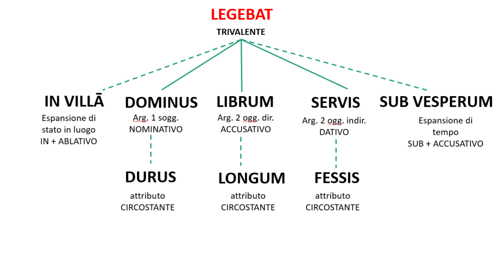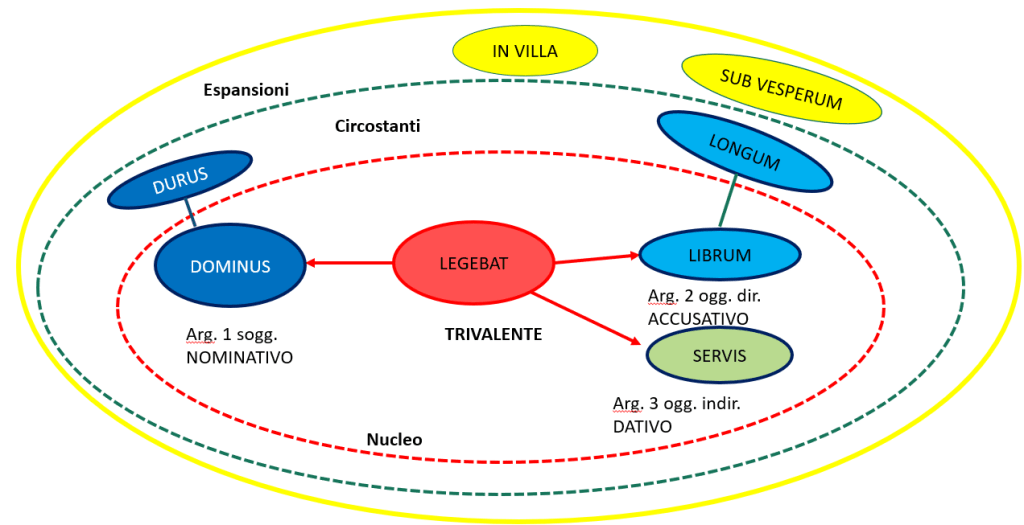 Tornando però ai problemi posti dalla rappresentazione grafica con questo schema, si prenda la seguente frase di esempio: In villa sub vesperum durus dominus longum librum servis legēbat. Si tratta di un enunciato che può essere affrontato nei primi mesi di latino ma, se si chiede in classe di rappresentarlo con uno schema valenziale sul modello di Sabatini, le capacità grafiche dello studente vengono subito messe alla prova (e anche quelle dell’insegnante che crea una slide o deve disegnare su tablet o su lavagna in ardesia…). Si perde, in effetti, più tempo nel disegnare uno schema graficamente “decente” che nella sua traduzione o nell’analisi lineare della frase. I problemi, poi, si moltiplicano se la lezione è condotta “a distanza”, come è accaduto da marzo 2020…