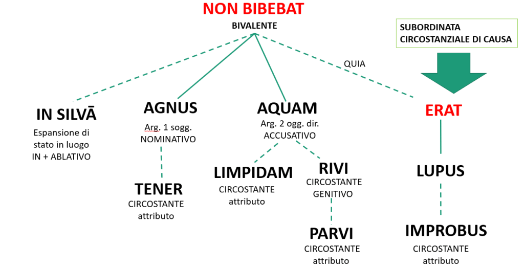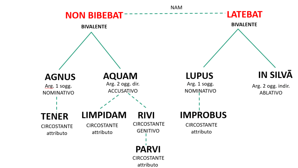 Analogamente, usando la medesima convenzione delle linee tratteggiate e continue, se alla principale seguisse una coordinata, la frase Tener agnus parvi rivi limpidam aquam non bibebat; nam improbus lupus in silva latebat si rappresenterebbe nel modo dell’immagine sottostante, con un collegamento orizzontale, tratteggiato, tra la principale e la coordinata.