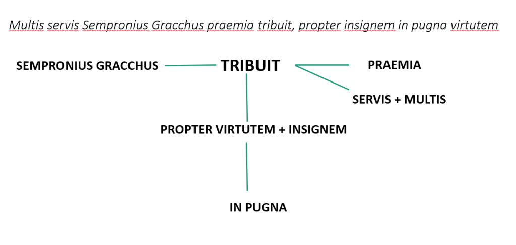 Il docente che desidera usare il metodo valenziale nel latino si trova però di fronte a una prima problematica: come schematizzare quella frase? Quale metodo grafico usare? Io stesso, nei tre anni di insegnamento del latino e dell’italiano con metodo valenziale, ho cambiato “in corso d’opera” gli strumenti in vista di una maggiore fruibilità degli stessi e, ovviamente, per le sopravvenute condizioni di didattica a distanza. La sostituzione di un metodo grafico con un altro non è sicuramente l’ideale, ma se l’insegnante motiva e fa ragionare (verbo chiave) la classe sulle scelte didattiche effettuate, credo possa essere addirittura arricchente. Nel Dossier dal titolo Qualche riflessione teorica e buone pratiche per l’insegnamento e dell’italiano e delle lingue classiche, numero di settembre 2017 di «Nuova Secondaria», rivista di innovazione pedagogica e didattica, la Prof.ssa Mazzacchera faceva un “bilancio” delle possibili rappresentazioni grafiche di frasi attraverso la presentazione dei modelli di Proverbio, Andreoni Fontecedro e Sabatini. Le mie considerazioni partono da quell’imprescindibile articolo, in cui si analizzava, tra le altre cose, anche l’applicazione del metodo valenziale alla lingua greca (si legga quindi il contributo dell’autrice citata, dal titolo Il modello valenziale e le lingue classiche, alle pp. 150-178, prestando attenzione, in particolare, alle pp. 160-167).