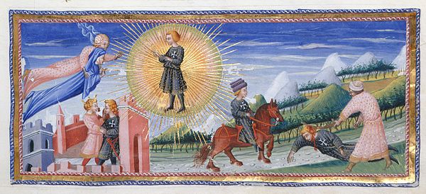 Com’è noto, nel canto XVII del Paradiso Dante incontra l’antenato Cacciaguida, che gli profetizza l’esilio, l’abbandono della compagnia «malvagia e scempia» e il primo rifugio presso il «gran Lombardo», che «’n su la scala porta il santo uccello». I commenti scolastici, in riferimento a questo passo, identificano solitamente la battaglia sanguinosa con quella della Lastra, mentre oscillano tra Alboino e Bartolomeo della Scala sul personaggio alluso dall’espressione «gran Lombardo». Si ricordi inoltre che tale canto del Paradiso viene scritto, presumibilmente, tra il 1318 e il 1320 e quindi Dante sta rievocando un evento piuttosto lontano nel tempo.