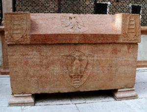 Ma è il riferimento alla tomba dei Dalla Scala a dare una linfa decisiva alla tesi di Pellegrini: Cacciaguida, nel cielo di Marte, fa riferimento al sant’uccello presente sullo stemma e a Verona sono presenti, com’è noto, le arche degli Scaligeri, in particolare una che reca un’aquila, attribuita proprio a Bartolomeo. Nessuna delle fonti veronesi attribuisce ad altri questa tomba, tanto che Cangrande della Scala, il personaggio in cui Dante riporrà tante speranze di rigenerazione futura per l’Italia, e Alboino della Scala, nelle loro tombe, presentano non un’aquila, bensì delle armi. Quindi l’araldica si dimostra uno strumento per certificare che il primo ospite di Dante fu proprio Bartolomeo, che si sposò con la ghibellinissima Costanza d’Antiochia, pronipote di Federico II di Svevia, che portava, sui suoi stemmi, l’aquila imperiale. La tomba di Bartolomeo, come si può notare dall’immagine sottostante, reca proprio lo stemma scaligero con la scala a quattro pioli sormontata da un’aquila, come si descrive nel verso di Paradiso XVII, «che ’n su la scala porta il santo uccello».