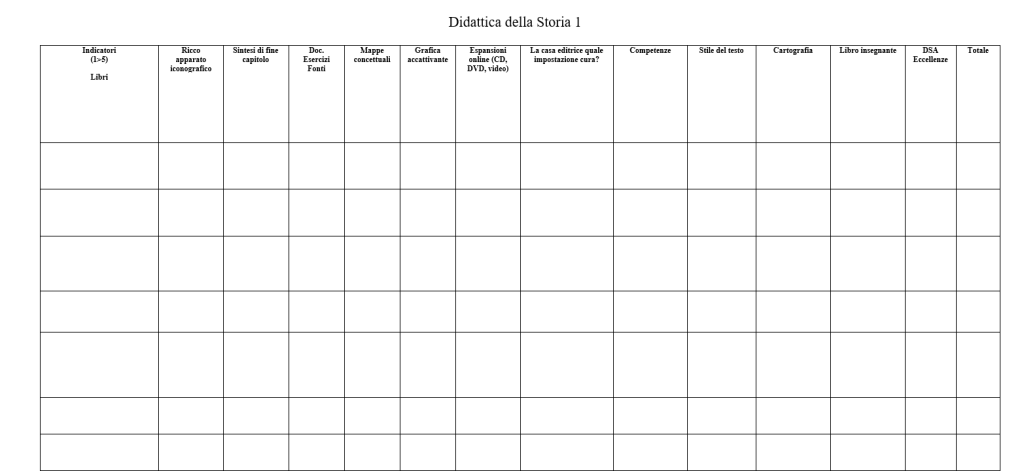Prima di tutto: ci sono dei criteri oggettivi per scegliere un libro di testo? A tal proposito ricordo ancora con piacere il laboratorio di Storia e Geografia del TFA I ciclo, che ho svolto nell’anno accademico 2012-2013: la bravissima docente che gestiva il corso ci diede una tabella con cui valutare un libro di testo e, nella scuola paritaria in cui insegnavo, provammo a condurre le riunioni di dipartimento di aprile per la scelta dei manuali basandoci su questi criteri. Per chi vuol curiosare, vi allego la tabella, su cui abbiamo lavorato durante il corso per giudicare diversi manuali di “geostoria” (mostro a due teste creato da Mariastella Gelmini); si trattava, all’atto pratico, di dare un voto da 1 a 5 (con sufficienza a 3) per i criteri individuati, tra i quali ricco apparato iconografico, sintesi di fine capitolo, documenti, esercizi, fonti, presenza di mappe concettuali e via dicendo. In linea teorica, il manuale presentato dai rappresentanti che avrebbe ottenuto il maggior numero di punti sarebbe stato adottato per il prossimo anno scolastico…