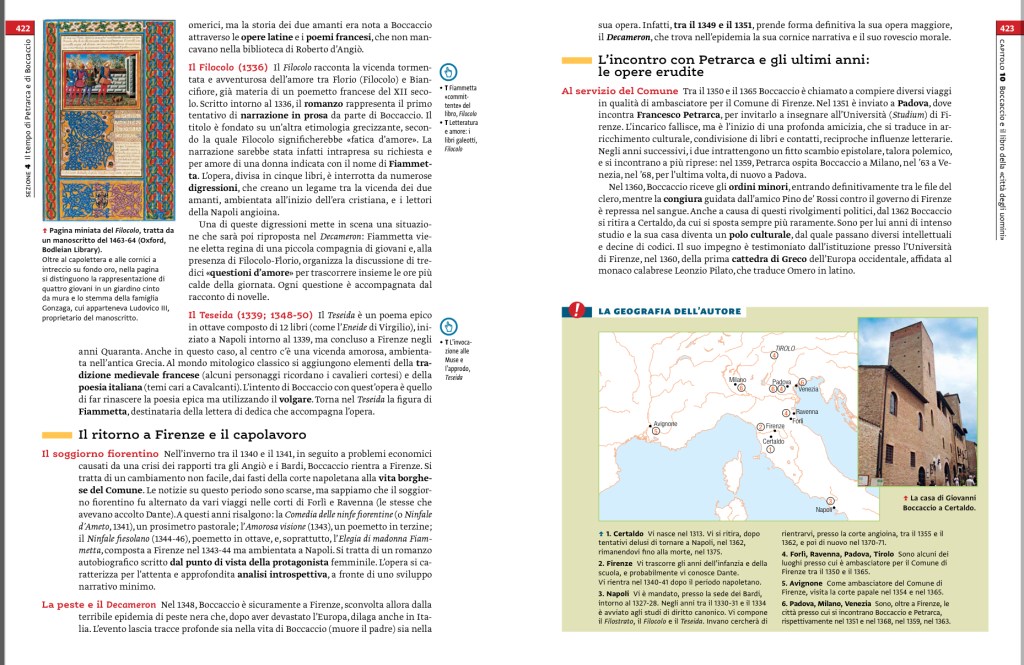 Un terzo criterio che adotto nella scelta dei libri è l‘apparato iconografico: i manuali non devono essere “troppo scritti”, ma lasciare spazio a trasposizioni iconografiche del testo, a immagini dell’autore o dei luoghi della sua biografia. Ricordo ancora che, nel 2014, quando cambiammo il “Luperini” (sacrilegio!), ci indirizzammo verso l’allora Rosa fresca novella di Bologna-Rocchi perché affascinati dal ricco corredo di immagini, che rendeva il testo piacevole alla lettura e accattivante, tanto per gli studenti quanto per noi insegnanti. Anche ora, Letteratura visione del mondo, a cui collabora anche Giuliano Rossi, si caratterizza per un connubio tra testo e immagini che ne fanno un manuale sicuramente di grande attrattiva. Negli stessi volumi sono presenti delle linee del tempo che intrecciano vita dell’autore, eventi letterari, storici e culturali, ma anche tabelle riassuntive, infografiche e mappe che ricapitolano i concetti fondamentali di un capitolo o di una sezione.