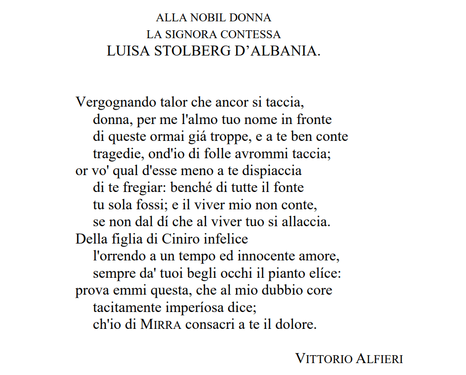 L’opera, com’è noto, è dedicata a Louise Stolberg, più conosciuta come contessa d’Albany e, per una efficace introduzione alla tragedia, è opportuno leggere il sonetto a lei dedicato, che precede l’atto I, cercando, in sede di spiegazione, di soffermarsi su alcuni termini, che mostrano le evidenti fonti dell’opera e come Alfieri abbia ben presente Dante e Tasso, oltre ad Aristotele. Il folle del v. 4 potrebbe infatti evocare il folle volo di Ulisse nel canto XXVI dell’Inferno, mentre il fregiar reca forse eco del Proemio della Gerusalemme liberata («e tu perdona / s’intesso fregi al ver», canto I, ottava 3, vv. 6-7). Ma è nei versi successivi che si manifestano termini desunti dalla Poetica di Aristotele, punto di riferimento per chi voleva elevare la tragedia italiana al modello greco: quell’orrendo amore e il dolore sono una ripresa evidente del “terrore e della pietà” che deve colpire, secondo la Poetica, lo spettatore alla vista delle sventure della protagonista, definita infelice, con una tessera virgiliana, che evoca l’infelix Dido, la cui vicenda, com’è noto, si conclude allo stesso modo di quella di Mirra, ovvero con il suicidio della protagonista su una spada.