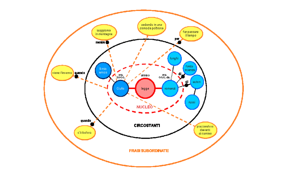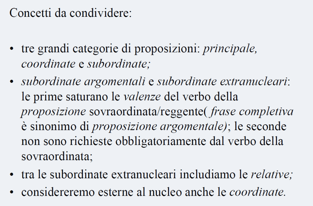 In questi anni di insegnamento ho capito che gli studenti hanno bisogno, specie in grammatica, di concetti chiari e di un insegnante che abbia senso pratico e non si dilunghi per ore ed ore a sbrodolare contenuti. La grammatica valenziale, modello estremamente sintetico ed efficace, mette poi in luce la ricorsività della lingua: così come esistono argomenti e circostanti, studiati in classe prima, allo stesso modo esisteranno subordinate argomentali e circostanziali, che svolgono il medesimo ruolo nella frase complessa. Così, al posto di trattare le subordinate come un elenco della spesa, è opportuno spiegarne la funzione e il loro rapporto con la principale; esse si dispongono in tre categorie: le argomentali (soggettive, oggettive, interrogative indirette, dichiarative, completive indirette) che sono fondamentali per chiarire il significato della reggente, che sarebbe “monca” senza la loro presenza; le circostanziali (o non-argomentali oppure extra-nucleari), ovvero tutte quelle subordinate che sono accessorie, libere (qui troviamo, p.e. la proposizione temporale, causale, ipotetica, concessiva, finale, consecutiva, comparativa, modale, avversativa e via dicendo). Un discorso a parte meritano le relative, dette attributive, dal momento che svolgono nella frase complessa la medesima funzione di un attributo e hanno quindi sempre un antecedente cui si riferiscono.
