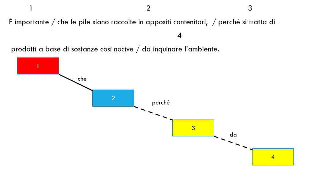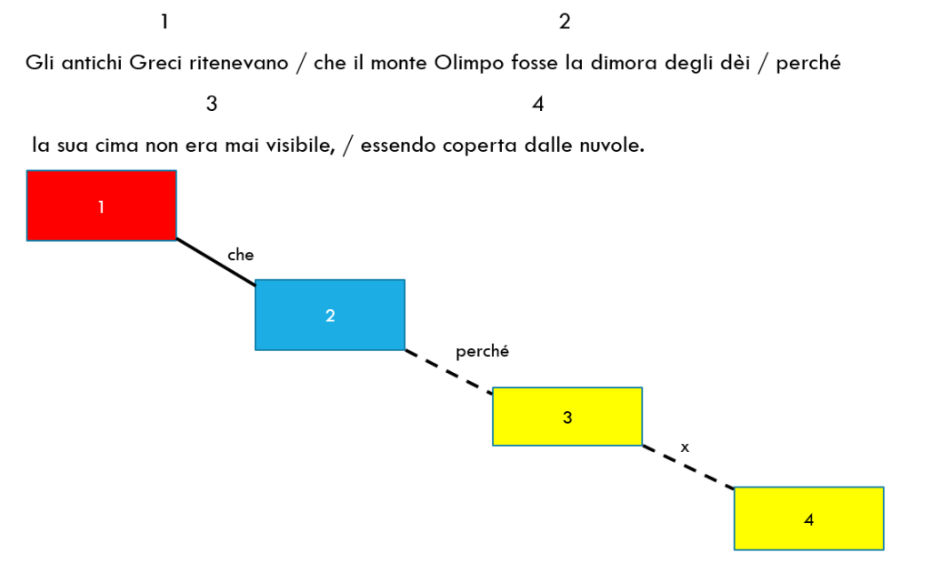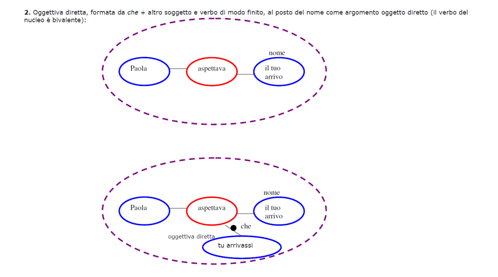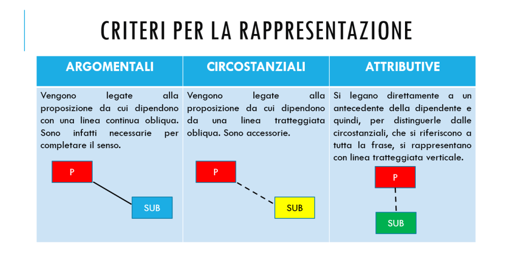 Ritengo quindi che nella pratica didattica quotidiana questa convenzione, scientificamente ineccepibile, debba lasciare spazio a modelli più semplici e funzionali, prendendo ovviamente spunto dalle indicazioni del Presidente onorario dell’Accademia della Crusca. Una soluzione può essere quella di distinguere chiaramente, nella rappresentazione a grafico, le proposizioni argomentali (legate alla reggente da linea obliqua continua), da quelle circostanziali (legate da linea obliqua tratteggiata) e attributive (legate da linea tratteggiata verticale); le prime sono necessarie per completare il senso della reggente, mentre le seconde corrispondono ai complementi liberi, da collegare al nucleo con linea tratteggiata. Si perde un po’ di scientificità, ma si recupera tempo nella rappresentazione e non si perde di vista il principale motivo di queste operazioni: far comprendere agli studenti la struttura di un periodo e le sue relazioni logiche.