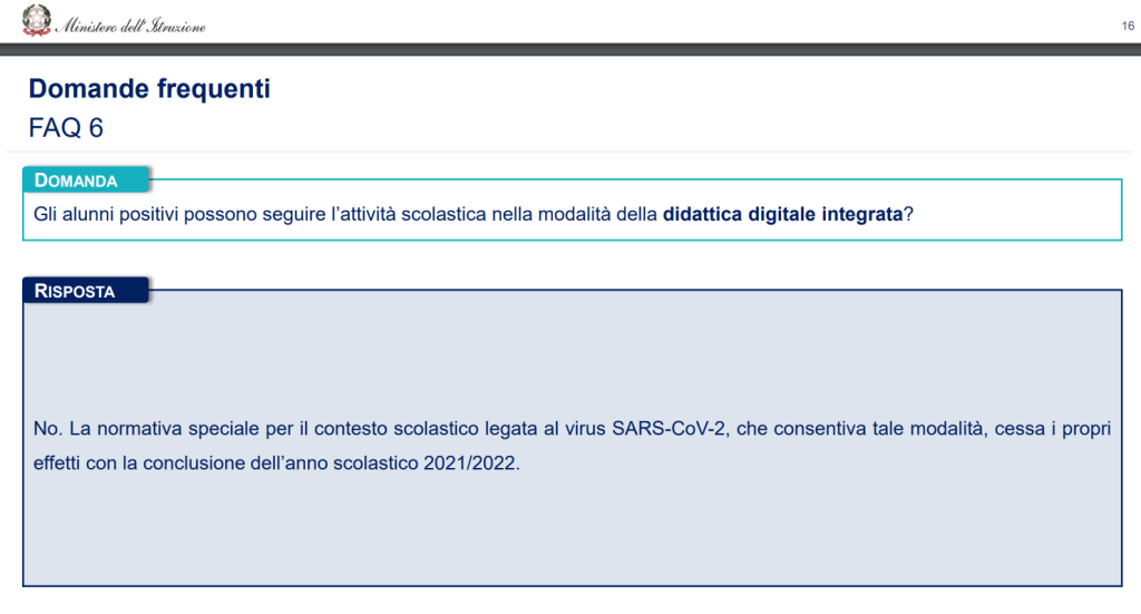 Cominciamo ab ovo: domenica (…) 28 agosto il MIUR, con il Vademecum contenente le Indicazioni per l’a.s. 2022-2023, ha precisato come dalle strategie di contenimento per la diffusione dell’infezione in ambito scolastico si sarebbe dovuti passare a strategie di mitigazione; fin qui nulla di sconvolgente: ormai le misure di prevenzione dal covid sono saltate in ogni ambito (a parte quello ospedaliero), le mascherine saranno protagoniste delle prossime puntate di Chi l’ha visto? e imporle a scuola sarebbe stata la solita “foglia di fico” tipicamente italiana. Tuttavia è nelle FAQ n. 6 che è presente una puntualizzazione sconvolgente, specie per il pregresso degli ultimi due anni: alla Frequently Asked Question “Gli alunni positivi possono seguire l’attività scolastica nella modalità della didattica digitale integrata?”, la risposta del Legislatore è netta e perentoria: “No. La normativa speciale per il contesto scolastico legata al virus SARS-CoV-2, che consentiva tale modalità, cessa i propri effetti con la conclusione dell’anno scolastico 2021/2022“.