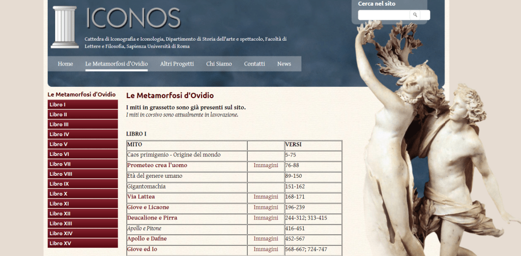 Ma è nella parte dei testi che si denoterà meglio la creatività didattica, dell’insegnante, una delle doti più sottovalutate della nostra professione; personalmente mi sono sempre domandato, alla base di ogni scelta didattica, quale ricaduta potrà avere nella formazione complessiva dello studente e ho deciso di usare lo stesso criterio per la selezione dei brani ovidiani. Inoltre è venuto in mio soccorso un sito, ICONOS, gestito dalla Cattedra di Iconografia e Iconologia della Facoltà di Lettere e Filosofia dell’Università La Sapienza di Roma; qui si sta predisponendo una catalogazione dei miti delle Metamorfosi, con la fortuna iconografica degli stessi nella letteratura e nell’arte. Ogni mito è accompagnato dai versi delle Metamorfosi in cui è narrato, dalla sua fortuna con l’aggiunta di una bibliografia per chi voglia approfondire determinati aspetti, anche in lingua straniera. Inoltre ogni mito presenta una sintesi molto accurata, utile anche in sede di introduzione dello stesso in classe.