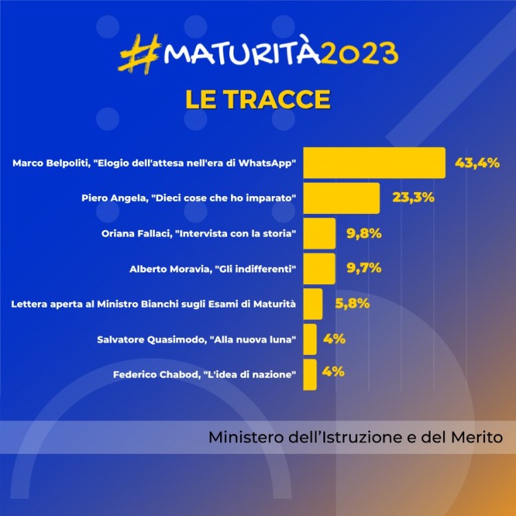 Si trattava, a mio avviso, di un testo più espositivo che argomentativo e anche le domande incorrevano in un problematica spesso presente nella tipologia B: la ripetizione di quanto già richiesto nel riassunto. La mia impressione è che gli studenti che hanno scelto questa traccia non abbiano potuto “uscire” dal rigido steccato della traccia, si siano distesi in lunghi ragionamenti ripetitivi e, magari privi di un’idea ben definita sul concetto di nazione, si siano limitati a riprendere elementi del brano proposto. Si trattava di un testo che intercettava poi dei contenuti tipicamente di classe quarta, adatto solo a studenti con buon senso critico e in grado di argomentare una loro posizione sul tema di nazione come elemento che, se frainteso con nazionalismo, può portare alla chiusura verso l’altro. Ha fatto una bella riflessione sulla traccia Luciano Canfora, chiarendo la differenza tra nazione e nazionalismo e invitando tutti a rimanere ancorati al testo, senza vedervi derive sovraniste legate alle posizioni di Fratelli d’Italia. Ma la mia domanda, leggendo la traccia mercoledì, è stata la seguente: quanti studenti avranno il coraggio di sceglierla e di prendere posizione sul tema, data la loro proverbiale assertività? 4 studenti su 100, come evidenzia bene il dato statistico pubblicato dal MIM nella foto sotto. Voto alla traccia: 5, ma da riciclare come compito in classe per chi ha classi quarte.