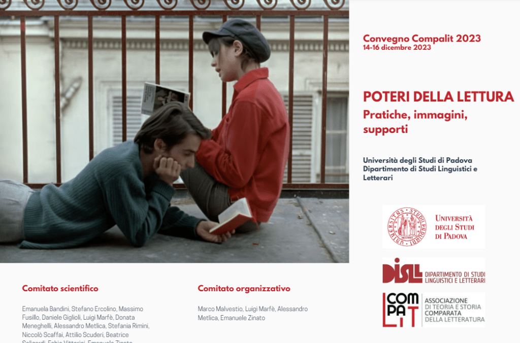Ore 14.10 di un freddo venerdì 15 dicembre 2023: nel cortile della sede del Beato Pellegrino dell’Università di Padova si sta svolgendo il pranzo dei partecipanti al Convegno Compalit “Poteri della lettura”: tra i colleghi che mi accolgono con il sorriso, volti più o meno noti, me ne colpisce uno in particolare, che mi stringe la mano con vigore, e che esclama: «Oh finalmente conosco la componente bergamasca della «Letteratura e noi»! Ma sei un gigante, Matteo!». I due giorni di Convegno si sarebbero rivelati un’esperienza arricchente umanamente e professionalmente, per la possibilità di confronto su temi a me cari: la didattica della letteratura e della lettura, ma soprattutto le difficoltà nel conciliare il programma “ministeriale” (un demonio inesistente, ma che si è impossessato di noi) con la promozione del piacere di leggere. Ma impagabile è stato vedere da vicino e chiacchierare con colleghi che prima erano soltanto un nome e cognome su Meet, sull’indirizzo di posta elettronica o sui social e che ora diventavano voci non filtrate da un audio e, soprattutto, corpi.