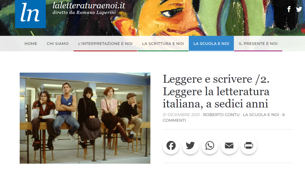 Tra gli interventi più destabilizzanti di quel convegno c’è stato, per me, quello del già citato Contu, dal titolo Il laboratorio di lettura e la letteratura canonica: il laboratorio morale, nel quale il collega umbro spiegava la sua modalità di gestire l’approccio coi classici attraverso una metodologia e un rigore che, francamente, io (ma credo anche molti altri colleghi eh) non sarei in grado di controllare (trovate un articolo sul tema qui). Contu ha presentato al panel di Compalit Scuola il suo programma di letture che si svolge nel tempo lungo (ordinario ed estivo) del triennio, secondo un metodo ricorsivo di presentazione, lettura, verifica delle opere del canone, arricchite da film, per rafforzare l’immaginario. Si trattava di esperienze concrete, attestate da screenshot del registro elettronico in cui si dimostrava la calendarizzazione, sin da settembre, delle verifiche orali annuali, incentrate su tre elementi-chiave delle letture: l’episodio, il personaggio, la propria interpretazione. Come spesso mi capita, ho iniziato a seguire il collega sui social, strumento che serve sempre per tenersi in contatto e, soprattutto, per scoprire nuove iniziative.
