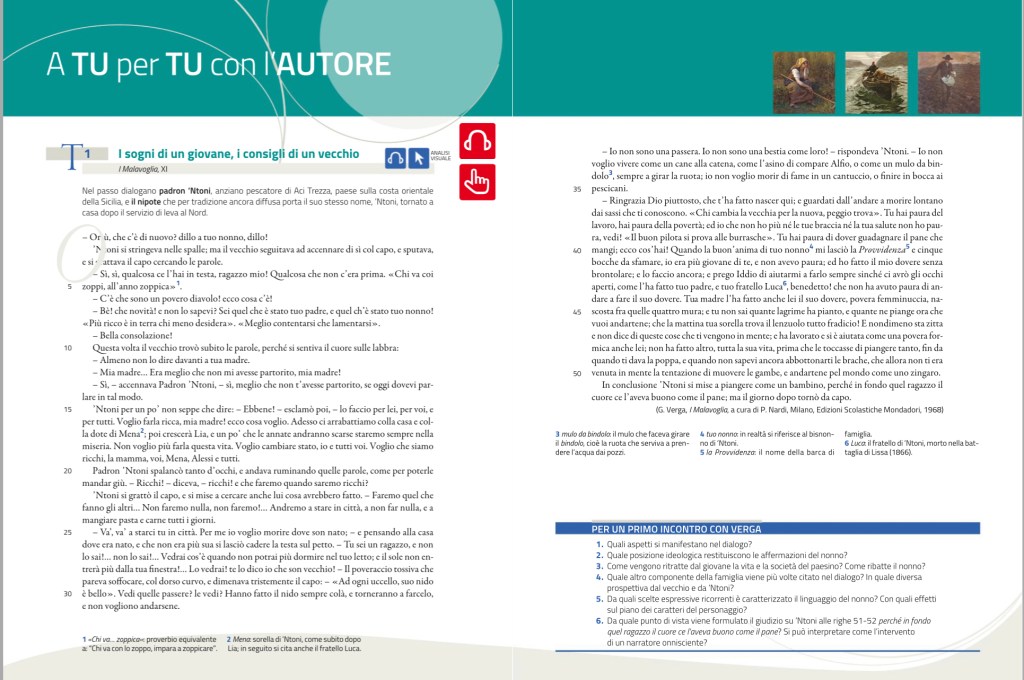 Tra i capitoli più godibili del volumetto di Marco Lodoli intitolato Il rosso e il blu, c’è sicuramente quello legato ai rincari dei libri di testo; qui il professore romano dipinge un quadro spietato della stanca classe docente italiana che, nei mesi primaverili, deve arginare l’assalto dei rappresentanti delle varie case editrici, decisi a «ipnotizzare gli insegnanti e convincerli che è arrivato il momento di cambiare il libro della loro materia. E i professori, che non decidono mai niente, che passano l’anno subendo programmi assurdi e riunioni dadaiste, vivono questi incontri come attimi di gloria: vengono vellicati, omaggiati, lisciati e inevitabilmente cadono nella trappola e cambiano il libro di testo adottato l’anno prima» (p. 26). Il risultato di questi incontri che, a dir la verità, spesso si concludono con un nulla di fatto, è però la possibilità di poter visionare (e, nel mio caso, portare a casa) dei volumi che si rivelano delle vere e proprie “chicche” ma che, per la necessità di convergere verso un’adozione per classi parallele e quanto più “nazionalpopolare” (si spiega così il successo dei diversi manuali a firma Baldi-Giusso), rimangono soltanto in consultazione personale. Tra questi colpisce per originalità di impostazione un recente volume di letteratura italiana edito da Zanichelli, L’ottima compagnia, di Marzia Fontana, Laura Forte e Maria Teresa Talice, in cui ogni classico è introdotto con due pagine intitolate A tu per tu con l’autore, che presentano, prima della biografia, un testo significativo corredato da domande volte a stimolare la riflessione della classe, secondo una modalità, quindi, in linea con il metodo induttivo. Allego, a titolo di esempio, una schermata relativa alla presentazione di Giovanni Verga attraverso un passo dal capitolo XI dei Malavoglia.