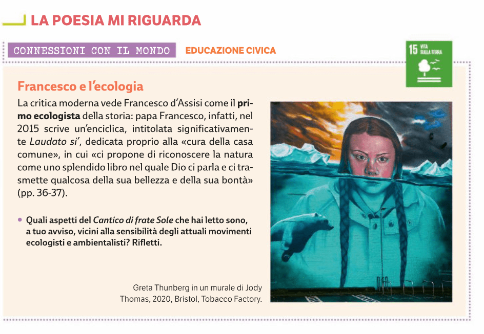 Si tratta del taglio che è stato dato alla Letteratura delle origini nell’unità intitolata Così lontani, così vicini all’interno dell’antologia Più vasto del cielo, a cui ho collaborato per alcune parti, tra cui questa, scritta a 4 mani con Linda Cavadini. Per fare un esempio, il Cantico di frate Sole viene prima analizzato nei suoi aspetti formali, contenutistici, tematici, ma nell’attività “La poesia mi riguarda” si propone una riflessione che leghi San Francesco ai movimenti ecologisti. Allo stesso modo, dal sonetto di Cecco Angiolieri S’i’ fosse foco si sviluppa una riflessione sulla satira nella società contemporanea. Credo che solo così la letteratura possa aver senso, al biennio, ma forse in tutto il percorso quinquennale.