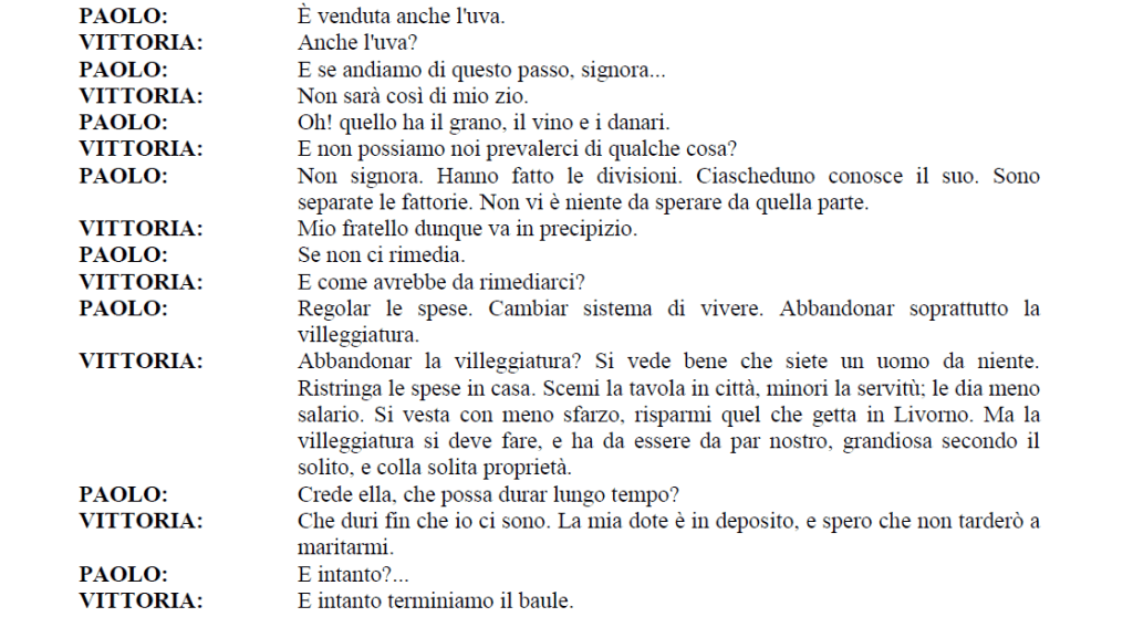Un’altra commedia che solitamente viene antologizzata, in uno o due passi, è quella intitolata Le smanie per la villeggiatura, messa in scena nel 1761 e in cui si presenta il dialogo tra il servo Fabrizio e Vittoria. La commedia, oltre a rappresentare una fase successiva (e più cupa) della produzione goldoniana, consente una efficace attualizzazione: nell’opera goldoniana Vittoria, travolta dai debiti, non vuole rinunciare alla villeggiatura, come si nota in questo scambio di battute della scena I dell’atto primo.