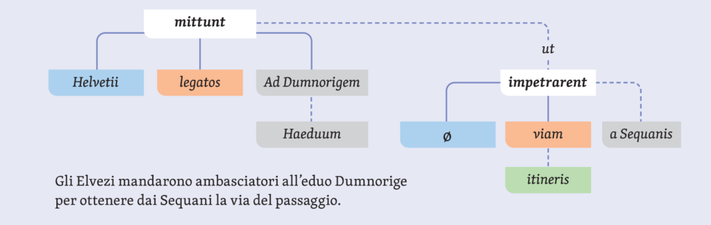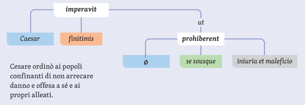 Anche se non ci si avvale del modello valenziale, è importante far lavorare gli studenti sul verbo della frase principale: impero vuole come terzo argomento qualcosa che si ordina, mentre mitto ha le sue valenze saturate già nella principale; ne deriva che il primo ut è completivo, il secondo circostanziale. Inoltre il primo è legato al verbo da una linea continua, mentre il secondo da una linea tratteggiata.