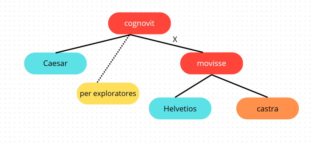 In questo caso l’infinitiva oggettiva equivarrebbe quindi alla seguente espressione: ab Helvetiis castrōrum motum. Ma è la rappresentazione grafica che chiarisce ogni dubbio, portando a vedere nell’infinitiva l’argomento 2 del verbo cognoscere.