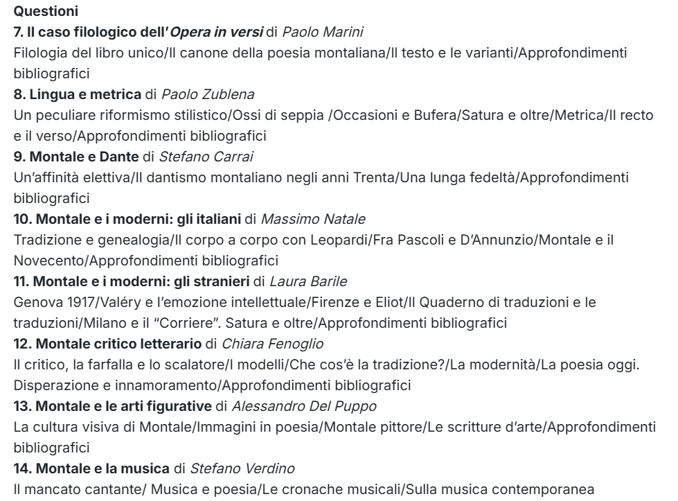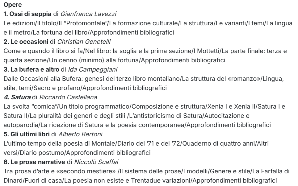 La caratteristica del volume è quella di radunare un’équipe di studiosi di primo livello, che si sono dedicati a singoli capitoli, forti delle loro competenze e di una “lunga fedeltà” con l’autore degli Ossi di seppia, come si può evincere dall’indice sottostante, che illustra la prima sezione della monografia, intitolata Opere.