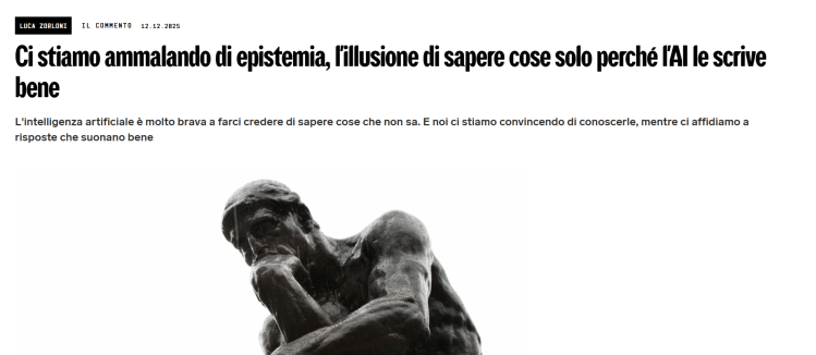 Nel corrente anno scolastico, come consiglio di classe delle Quarte Liceo Economico Sociale, abbiamo cercato di sensibilizzare gli studenti sui rischi di affidarsi ciecamente all’AI. Diciamolo senza mezzi termini: anche se si magnifica l’implementazione dello spirito critico grazie all’AI, questa viene usata per lo più come assistente personale e ripetitore a basso costo (per non parlare nello sconfinamento a psicologo gratuito). Quando, durante un compito domestico, si manifestano delle difficoltà, ecco che si apre CHAT GPT e si inizia una conversazione. In un bell’articolo analizzato in classe, uscito su Wired (recuperalo qui), si parla appunto di un’epistemia che si è sostituita all’episteme dell’antica Grecia. Secondo Luca Zorloni, infatti: epistemia «identifica questa nuova stagione della nostra società dominata dalla costruzione di una impressione di conoscenza che sta in piedi perché non si sa, perché non si sa delegare all’AI e perché non si sa controllare e verificare il risultato. Ci si bea, in compenso, di una risposta cucita talmente bene da illuderci di non poter essere che vera». Zorloni continua sostenendo che «L’AI ci renderà più stupidi se vorremo cullarci nella stupidità indotta. Se ci accontenteremo della prima risposta del chatbot, senza considerare i meccanismi probabilistici che governano il funzionamento dei grandi modelli linguistici».