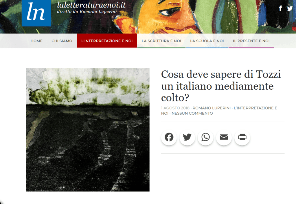 Romano Luperini, mio nume tutelare, considera Tozzi un autore imprescindibile, collocabile nella triade (insieme a Svevo e Pirandello) dei grandi prosatori di inizio Novecento, ma ammette anche che la sua fortuna è ancora scarsa, per i seguenti motivi: «il carattere apparentemente provinciale e periferico della sua personalità, la sgradevolezza della sua scrittura acre e amara, il carattere sperimentale della sua ricerca» (R. Luperini, Cosa deve sapere di Tozzi un italiano mediamente colto?, «La letteratura e noi», 01.08.2018, link qui).