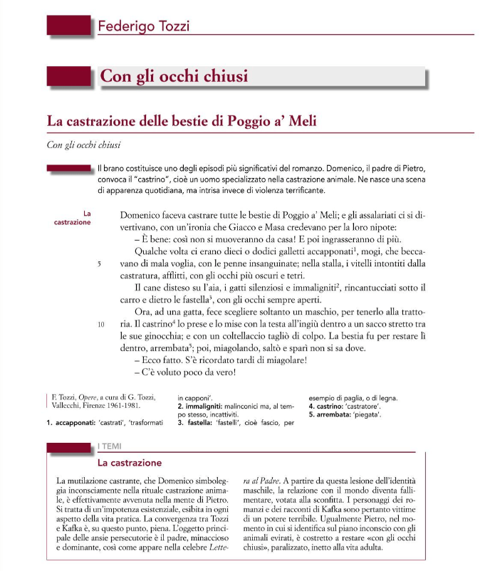 | 3 | La castrazione delle bestie di Poggio a’ Meli (da Domenico faceva castrare tutte le bestie a madia ancora aperta) | Perché si tematizza la tirannia del padre e l’inettitudine di Pietro. Si può collegare all’angoscia di castrazione e al complesso di Edipo descritti da Freud, oltre che al tema dei padri-padroni nella letteratura di inizio Novecento |